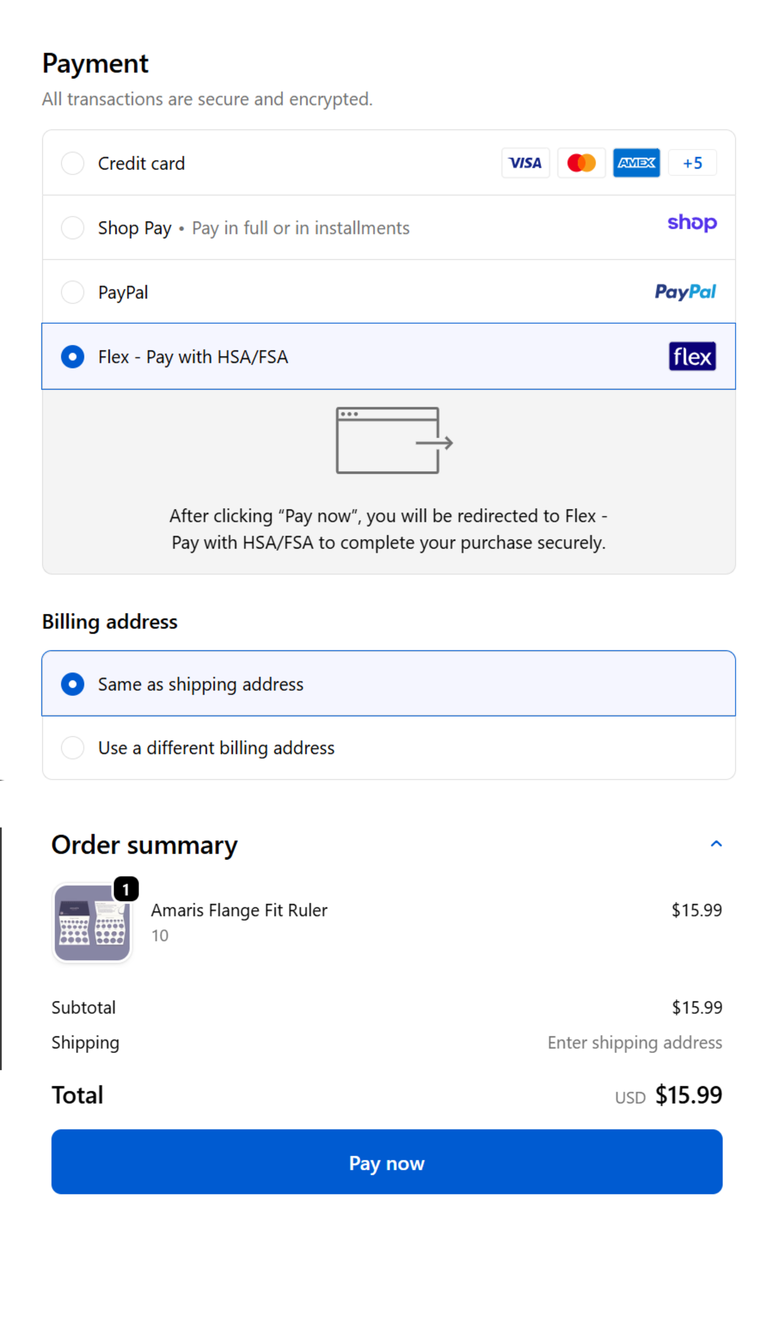After adding items to your cart, proceed to checkout and select the Flex option and enter the information from your HSA or FSA card. If you have items in your cart that do not qualify for HSA/FSA, you will be prompted to enter an additional form of payment to cover those items.